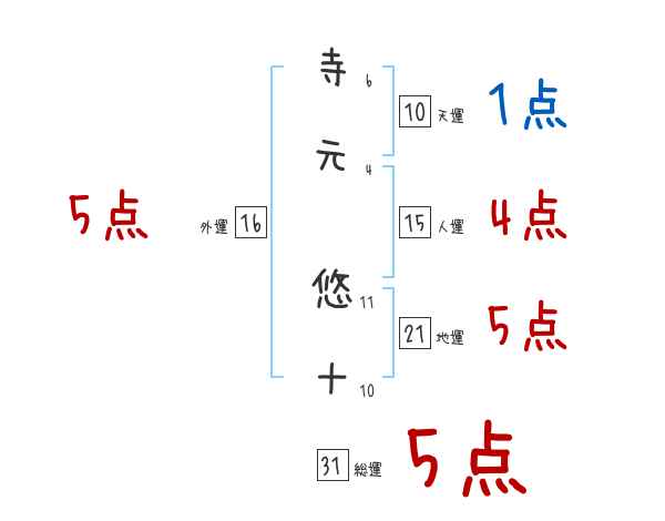 外運![]() | 寺元悠十さんの外運は16画の5つ星!人望が厚く大きく発展する。逆転成功が見える。 生活面を象徴する運勢です。外部から受ける影響力を表し、結婚運、家庭運や職場、環境への順応性を表します。 |