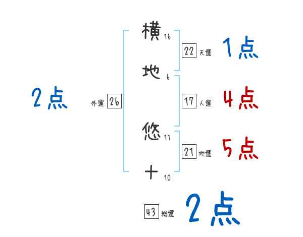 総運![]() | 横地悠十さんの総運は43画の2つ星!頑固な性格で独立心が強いかも。やや非現実的で浪費に注意しましょう。 あなたの人生を表す1番重要な運勢です。生涯を通じて影響する総合運となり、主に50歳以降の晩年期に影響を及ぼします。 |