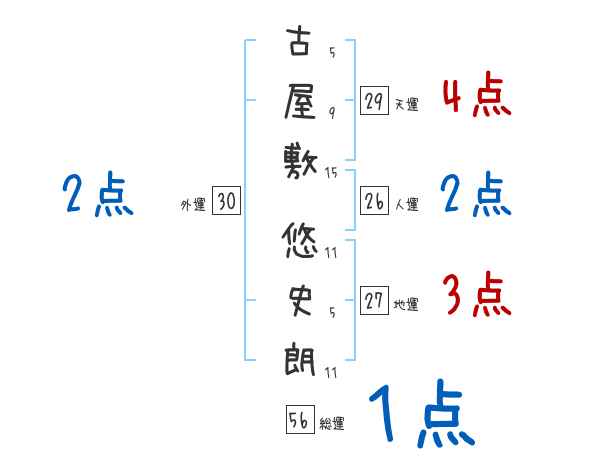 総運![]() | 古屋敷悠史朗さんの総運は56画の1つ星!消極的で無気力になりがち。誠実な気持ちが必要でしょう。 あなたの人生を表す1番重要な運勢です。生涯を通じて影響する総合運となり、主に50歳以降の晩年期に影響を及ぼします。 |