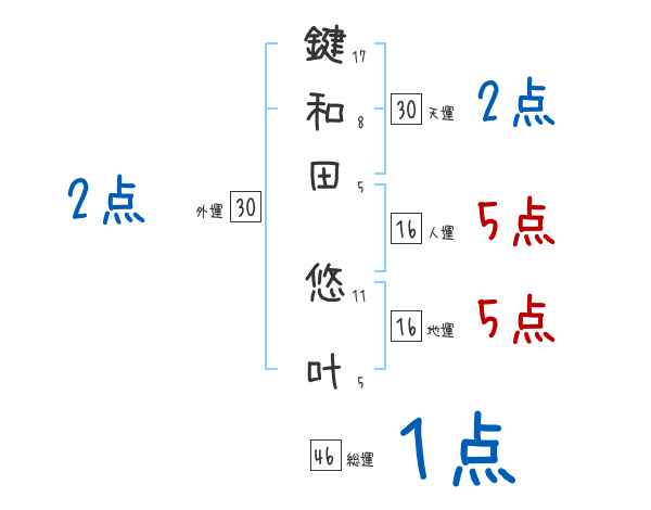 天運![]() | 鍵和田悠叶さんの天運は30画の2つ星!浮き沈みの激しさに注意しましょう。 家系が持つ宿命的な運勢を表します。祖先から受け継いだ苗字ですので自分の力が及びません。家柄を象徴します。 |