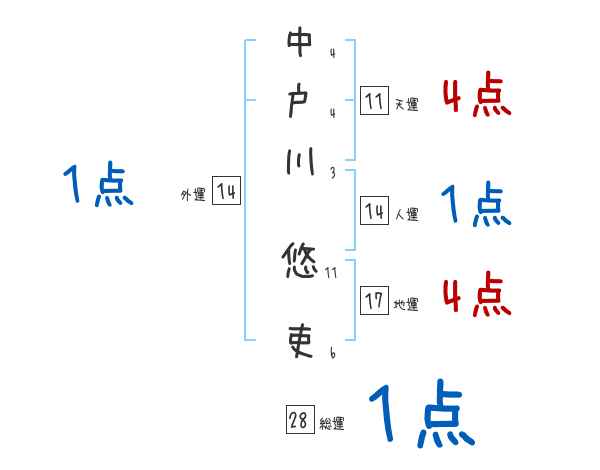 天運![]() | 中戸川悠吏さんの天運は11画の4つ星!着実に富や地位を得る幸運な人生。 家系が持つ宿命的な運勢を表します。祖先から受け継いだ苗字ですので自分の力が及びません。家柄を象徴します。 |