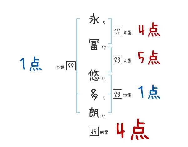 天運![]() | 永冨悠多朗さんの天運は17画の4つ星!積極的な行動力。地位を気づき財産を手に入れる。純粋な心と直感力。 家系が持つ宿命的な運勢を表します。祖先から受け継いだ苗字ですので自分の力が及びません。家柄を象徴します。 |
