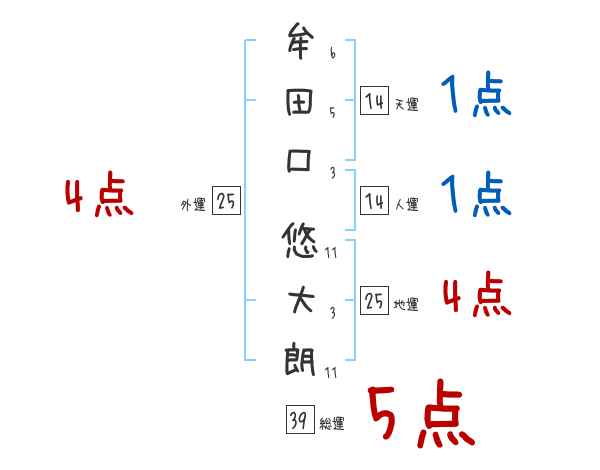 総運![]() | 牟田口悠大朗さんの総運は39画の5つ星!社交性に優れ人望が厚い。人の上に立ち成功する。 あなたの人生を表す1番重要な運勢です。生涯を通じて影響する総合運となり、主に50歳以降の晩年期に影響を及ぼします。 |
