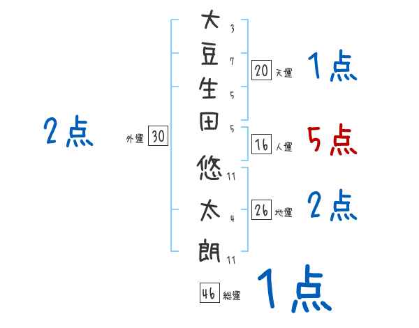 総運![]() | 大豆生田悠太朗さんの総運は46画の1つ星!迷走することが多く苦労するかも。目先のことにとらわれないように。 あなたの人生を表す1番重要な運勢です。生涯を通じて影響する総合運となり、主に50歳以降の晩年期に影響を及ぼします。 |