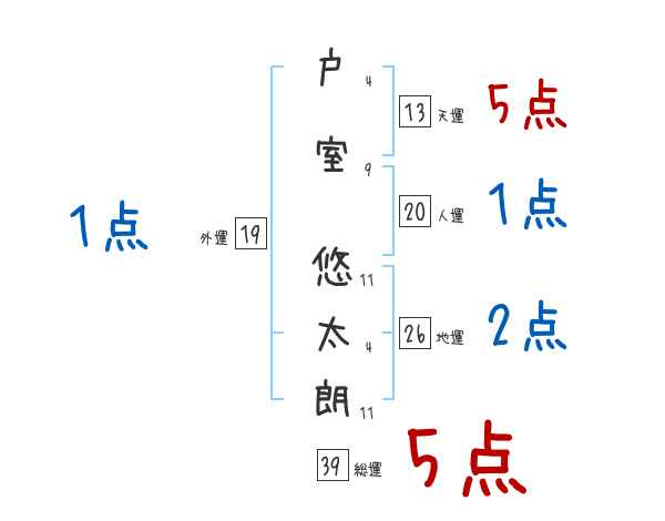 総運![]() | 戸室悠太朗さんの総運は39画の5つ星!社交性に優れ人望が厚い。人の上に立ち成功する。 あなたの人生を表す1番重要な運勢です。生涯を通じて影響する総合運となり、主に50歳以降の晩年期に影響を及ぼします。 |