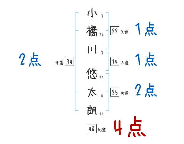 総運![]() | 小橋川悠太朗さんの総運は48画の4つ星!賢明な性格で人望が厚い。指導力があり多くの人に尊敬される。 あなたの人生を表す1番重要な運勢です。生涯を通じて影響する総合運となり、主に50歳以降の晩年期に影響を及ぼします。 |