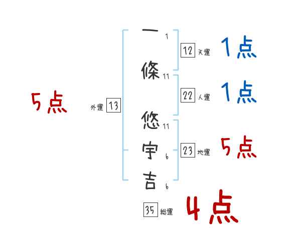 天運![]() | 一條悠宇吉さんの天運は12画の1つ星!簡単な失敗で諦めてしまいやすいかも。着実に行動すると良いでしょう。 家系が持つ宿命的な運勢を表します。祖先から受け継いだ苗字ですので自分の力が及びません。家柄を象徴します。 |