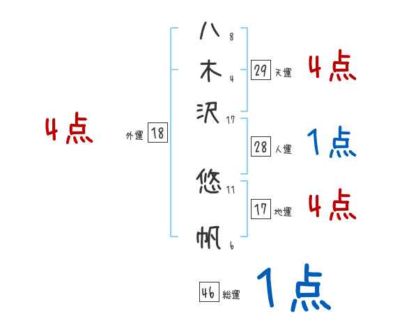 天運![]() | 八木沢悠帆さんの天運は29画の4つ星!完全主義で才能がある。厳格な心の持ち主。 家系が持つ宿命的な運勢を表します。祖先から受け継いだ苗字ですので自分の力が及びません。家柄を象徴します。 |