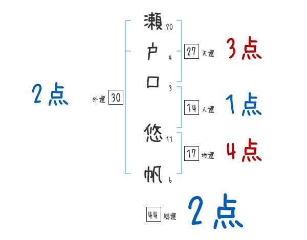 総運![]() | 瀬戸口悠帆さんの総運は44画の2つ星!誠実で慎重な性格。物事を考えすぎないように注意しましょう。 あなたの人生を表す1番重要な運勢です。生涯を通じて影響する総合運となり、主に50歳以降の晩年期に影響を及ぼします。 |