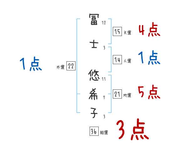 総運![]() | 冨士悠希子さんの総運は36画の3つ星!先見性が豊かです。多少神経質で苦労することも。 あなたの人生を表す1番重要な運勢です。生涯を通じて影響する総合運となり、主に50歳以降の晩年期に影響を及ぼします。 |
