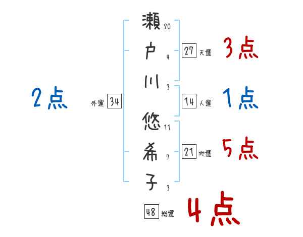 天運![]() | 瀬戸川悠希子さんの天運は27画の3つ星!頭脳明晰だが強情で摩擦が多い傾向。孤立に注意。 家系が持つ宿命的な運勢を表します。祖先から受け継いだ苗字ですので自分の力が及びません。家柄を象徴します。 |