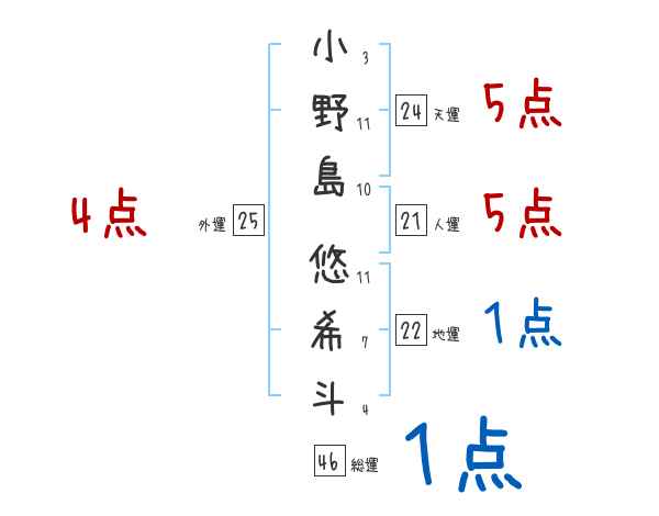 人運![]() | 小野島悠希斗さんの人運は21画の5つ星!統率力がある。独立し成功する。名誉を手に入れる。 性格や才能などを表す2番目に重要な運勢です。人間関係や協調性、社会的な成功に影響します。主に20歳から50歳ぐらいまでの中年期の運勢を表します。 |