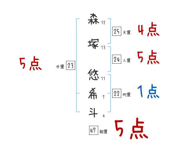 外運![]() | 森塚悠希斗さんの外運は23画の5つ星!想像力に優れ活力がある。一代で成功し名誉を手に入れる。 生活面を象徴する運勢です。外部から受ける影響力を表し、結婚運、家庭運や職場、環境への順応性を表します。 |