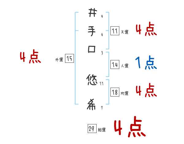 天運![]() | 井手口悠希さんの天運は11画の4つ星!着実に富や地位を得る幸運な人生。 家系が持つ宿命的な運勢を表します。祖先から受け継いだ苗字ですので自分の力が及びません。家柄を象徴します。 |