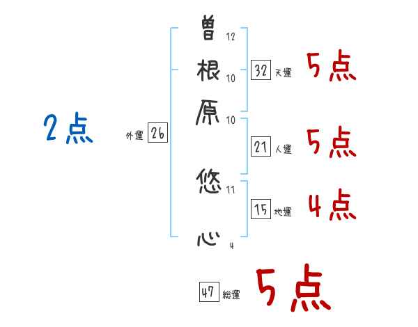 天運![]() | 曽根原悠心さんの天運は32画の5つ星!柔軟性があり成功する。チャンスが多く金運が良い。 家系が持つ宿命的な運勢を表します。祖先から受け継いだ苗字ですので自分の力が及びません。家柄を象徴します。 |