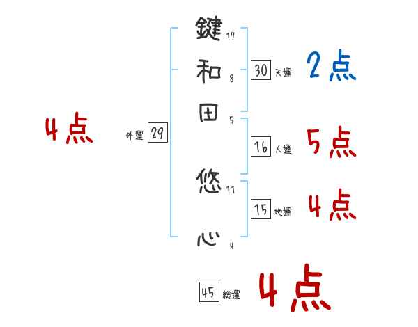 人運![]() | 鍵和田悠心さんの人運は16画の5つ星!人望が厚く大きく発展する。逆転成功が見える。 性格や才能などを表す2番目に重要な運勢です。人間関係や協調性、社会的な成功に影響します。主に20歳から50歳ぐらいまでの中年期の運勢を表します。 |