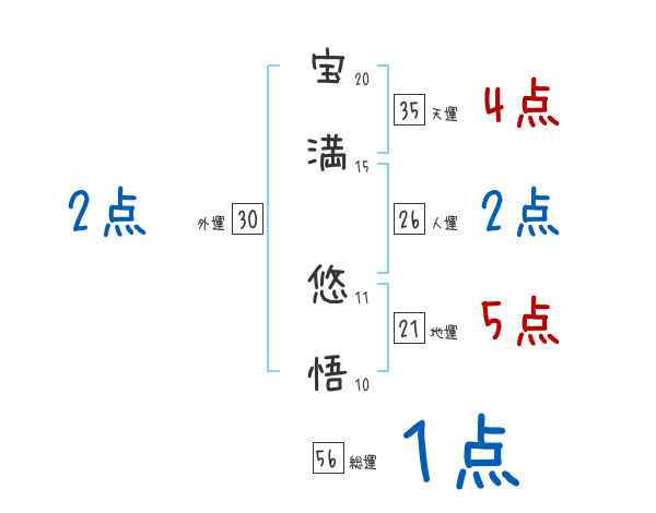 天運![]() | 宝満悠悟さんの天運は35画の4つ星!温厚な性格で感受性が高い。穏和な性格で人望が厚い。 家系が持つ宿命的な運勢を表します。祖先から受け継いだ苗字ですので自分の力が及びません。家柄を象徴します。 |