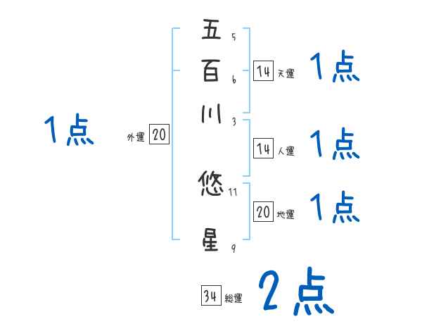天運![]() | 五百川悠星さんの天運は14画の1つ星!人に対して優しいがストレスを溜め込みがち。人間関係のトラブルを避けるよう気をつけましょう。 家系が持つ宿命的な運勢を表します。祖先から受け継いだ苗字ですので自分の力が及びません。家柄を象徴します。 |