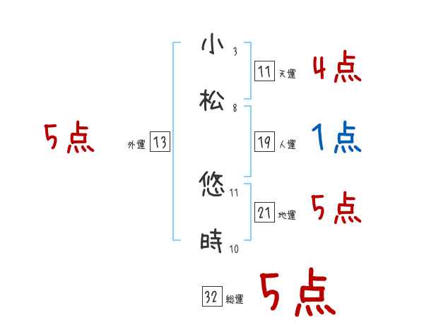 総運![]() | 小松悠時さんの総運は32画の5つ星!柔軟性があり成功する。チャンスが多く金運が良い。 あなたの人生を表す1番重要な運勢です。生涯を通じて影響する総合運となり、主に50歳以降の晩年期に影響を及ぼします。 |