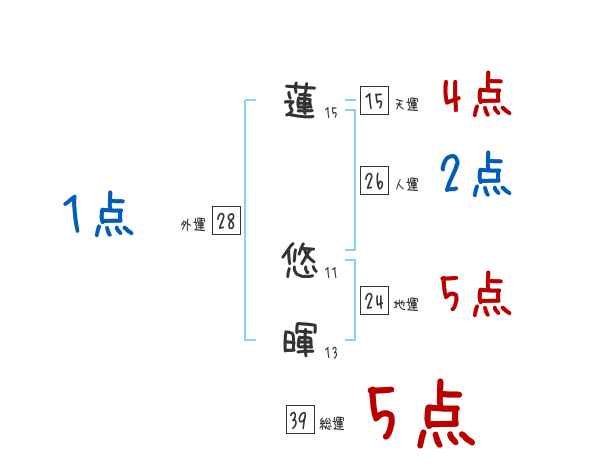 外運![]() | 蓮悠暉さんの外運は28画の1つ星!家庭環境に注意。スポーツで活躍できる能力があるかも。 生活面を象徴する運勢です。外部から受ける影響力を表し、結婚運、家庭運や職場、環境への順応性を表します。 |
