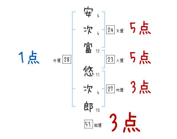 天運![]() | 安次富悠次郎さんの天運は24画の5つ星!家庭運が良く順調な人生。金運にも恵まれる。 家系が持つ宿命的な運勢を表します。祖先から受け継いだ苗字ですので自分の力が及びません。家柄を象徴します。 |