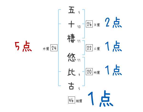 外運![]() | 五十棲悠比古さんの外運は24画の5つ星!家庭運が良く順調な人生。金運にも恵まれる。 生活面を象徴する運勢です。外部から受ける影響力を表し、結婚運、家庭運や職場、環境への順応性を表します。 |