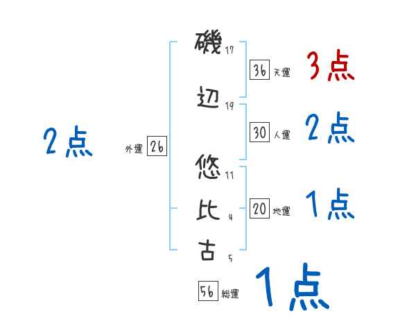 外運![]() | 磯辺悠比古さんの外運は26画の2つ星!波瀾万丈かも。信頼できる人を大事にしましょう。 生活面を象徴する運勢です。外部から受ける影響力を表し、結婚運、家庭運や職場、環境への順応性を表します。 |