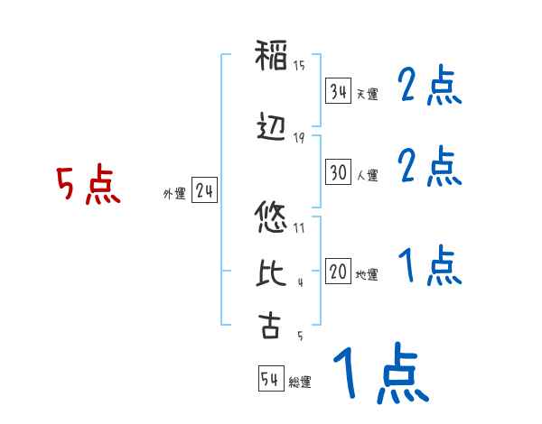 外運![]() | 稲辺悠比古さんの外運は24画の5つ星!家庭運が良く順調な人生。金運にも恵まれる。 生活面を象徴する運勢です。外部から受ける影響力を表し、結婚運、家庭運や職場、環境への順応性を表します。 |
