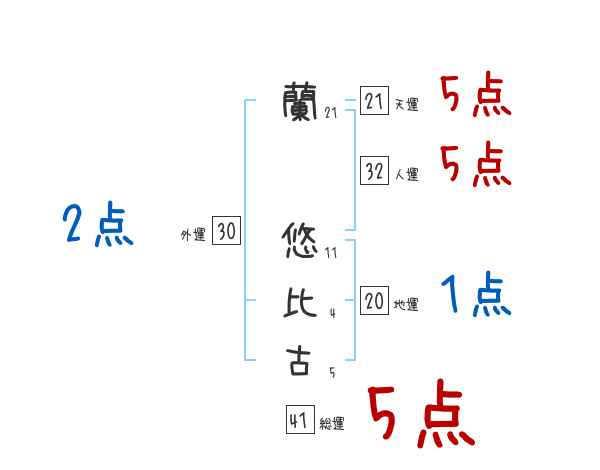 人運![]() | 蘭悠比古さんの人運は32画の5つ星!柔軟性があり成功する。チャンスが多く金運が良い。 性格や才能などを表す2番目に重要な運勢です。人間関係や協調性、社会的な成功に影響します。主に20歳から50歳ぐらいまでの中年期の運勢を表します。 |