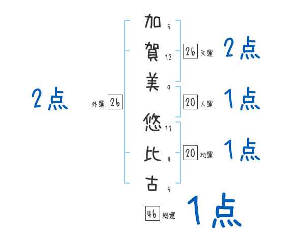 天運![]()  | 加賀美悠比古さんの天運は26画の2つ星!波瀾万丈かも。信頼できる人を大事にしましょう。 家系が持つ宿命的な運勢を表します。祖先から受け継いだ苗字ですので自分の力が及びません。家柄を象徴します。 |