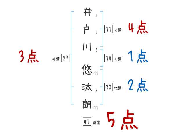天運![]() | 井戸川悠汰朗さんの天運は11画の4つ星!着実に富や地位を得る幸運な人生。 家系が持つ宿命的な運勢を表します。祖先から受け継いだ苗字ですので自分の力が及びません。家柄を象徴します。 |