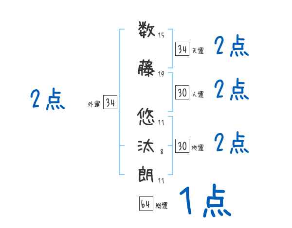 人運![]() | 数藤悠汰朗さんの人運は30画の2つ星!浮き沈みの激しさに注意しましょう。 性格や才能などを表す2番目に重要な運勢です。人間関係や協調性、社会的な成功に影響します。主に20歳から50歳ぐらいまでの中年期の運勢を表します。 |