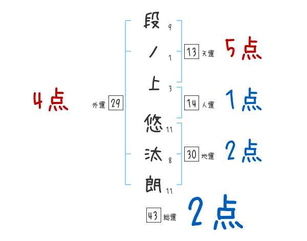 外運![]() | 段ノ上悠汰朗さんの外運は29画の4つ星!完全主義で才能がある。厳格な心の持ち主。 生活面を象徴する運勢です。外部から受ける影響力を表し、結婚運、家庭運や職場、環境への順応性を表します。 |