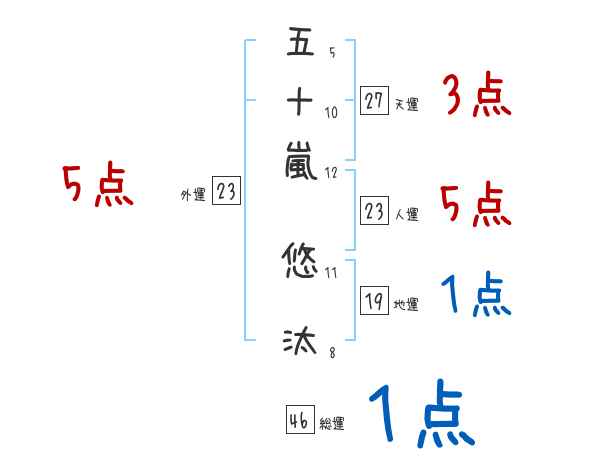 人運![]() | 五十嵐悠汰さんの人運は23画の5つ星!想像力に優れ活力がある。一代で成功し名誉を手に入れる。 性格や才能などを表す2番目に重要な運勢です。人間関係や協調性、社会的な成功に影響します。主に20歳から50歳ぐらいまでの中年期の運勢を表します。 |