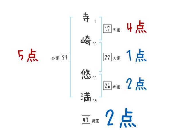 外運![]() | 寺崎悠満さんの外運は21画の5つ星!統率力がある。独立し成功する。名誉を手に入れる。 生活面を象徴する運勢です。外部から受ける影響力を表し、結婚運、家庭運や職場、環境への順応性を表します。 |