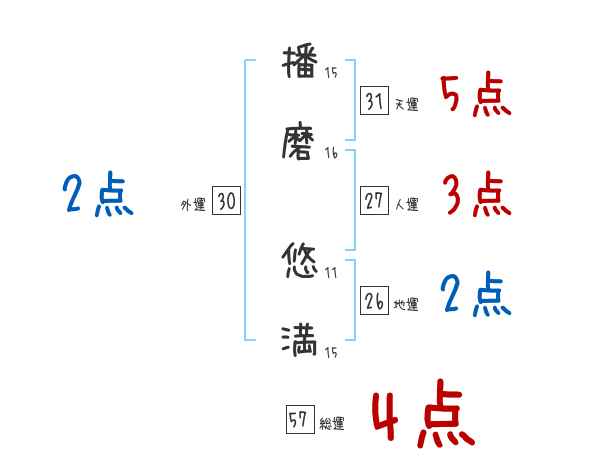 地運![]() | 播磨悠満さんの地運は26画の2つ星!波瀾万丈かも。信頼できる人を大事にしましょう。 個性を表す基礎的な運勢です。性格形成や対人関係、行動力など家庭環境に影響されます。主に誕生してから20歳くらいまでの若年期の運勢を表します。 |