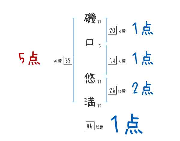 外運![]() | 磯口悠満さんの外運は32画の5つ星!柔軟性があり成功する。チャンスが多く金運が良い。 生活面を象徴する運勢です。外部から受ける影響力を表し、結婚運、家庭運や職場、環境への順応性を表します。 |