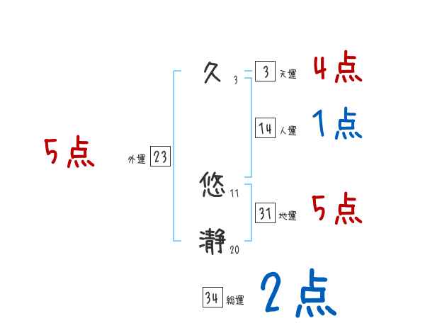 総運![]() | 久悠瀞さんの総運は34画の2つ星!独創性に優れるが、自尊心が強く災難に注意しましょう。 あなたの人生を表す1番重要な運勢です。生涯を通じて影響する総合運となり、主に50歳以降の晩年期に影響を及ぼします。 |