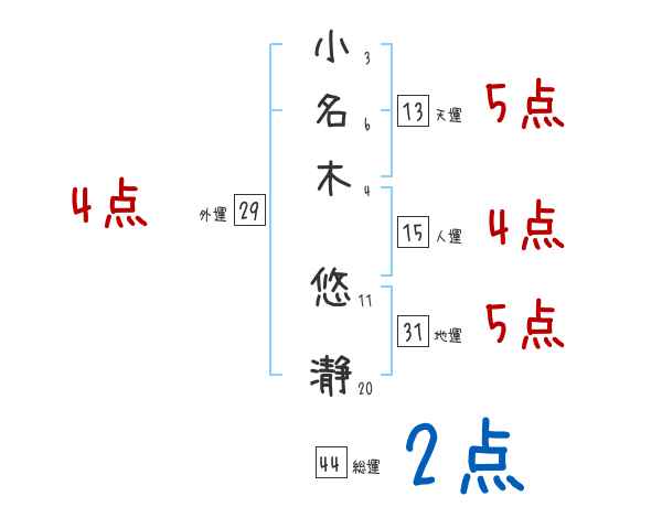 総運![]() | 小名木悠瀞さんの総運は44画の2つ星!誠実で慎重な性格。物事を考えすぎないように注意しましょう。 あなたの人生を表す1番重要な運勢です。生涯を通じて影響する総合運となり、主に50歳以降の晩年期に影響を及ぼします。 |