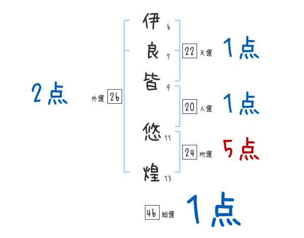外運![]() | 伊良皆悠煌さんの外運は26画の2つ星!波瀾万丈かも。信頼できる人を大事にしましょう。 生活面を象徴する運勢です。外部から受ける影響力を表し、結婚運、家庭運や職場、環境への順応性を表します。 |