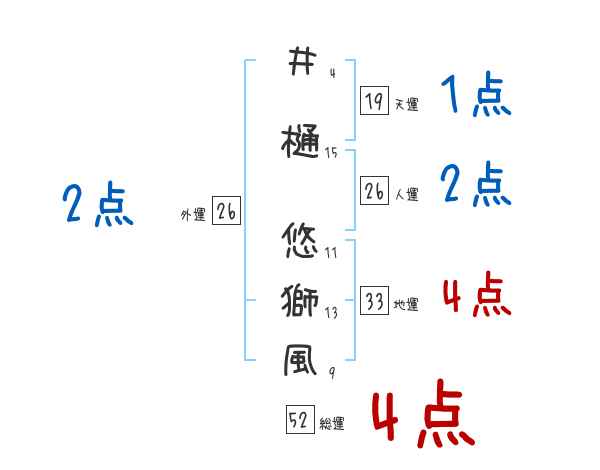 外運![]() | 井樋悠獅風さんの外運は26画の2つ星!波瀾万丈かも。信頼できる人を大事にしましょう。 生活面を象徴する運勢です。外部から受ける影響力を表し、結婚運、家庭運や職場、環境への順応性を表します。 |