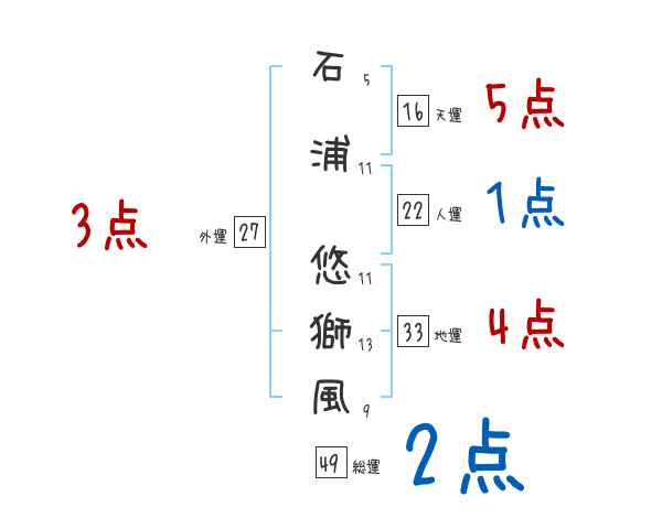 天運![]() | 石浦悠獅風さんの天運は16画の5つ星!人望が厚く大きく発展する。逆転成功が見える。 家系が持つ宿命的な運勢を表します。祖先から受け継いだ苗字ですので自分の力が及びません。家柄を象徴します。 |