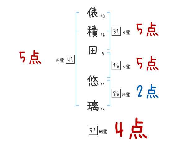 人運![]() | 俵積田悠璃さんの人運は16画の5つ星!人望が厚く大きく発展する。逆転成功が見える。 性格や才能などを表す2番目に重要な運勢です。人間関係や協調性、社会的な成功に影響します。主に20歳から50歳ぐらいまでの中年期の運勢を表します。 |
