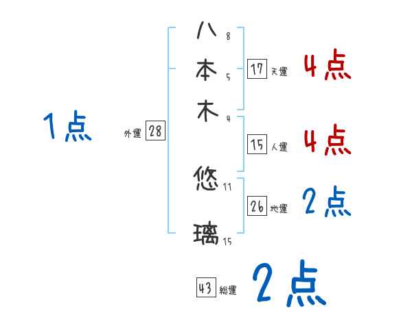 総運![]() | 八本木悠璃さんの総運は43画の2つ星!頑固な性格で独立心が強いかも。やや非現実的で浪費に注意しましょう。 あなたの人生を表す1番重要な運勢です。生涯を通じて影響する総合運となり、主に50歳以降の晩年期に影響を及ぼします。 |