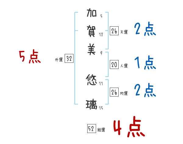 | 総運  | 加賀美悠璃さんの総運は52画の4つ星!先見性と独創性に優れ考える力がある。強運の持ち主。あなたの人生を表す1番重要な運勢です。生涯を通じて影響する総合運となり、主に50歳以降の晩年期に影響を及ぼします。 |