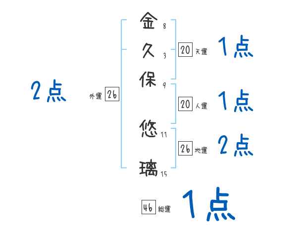 外運![]() | 金久保悠璃さんの外運は26画の2つ星!波瀾万丈かも。信頼できる人を大事にしましょう。 生活面を象徴する運勢です。外部から受ける影響力を表し、結婚運、家庭運や職場、環境への順応性を表します。 |