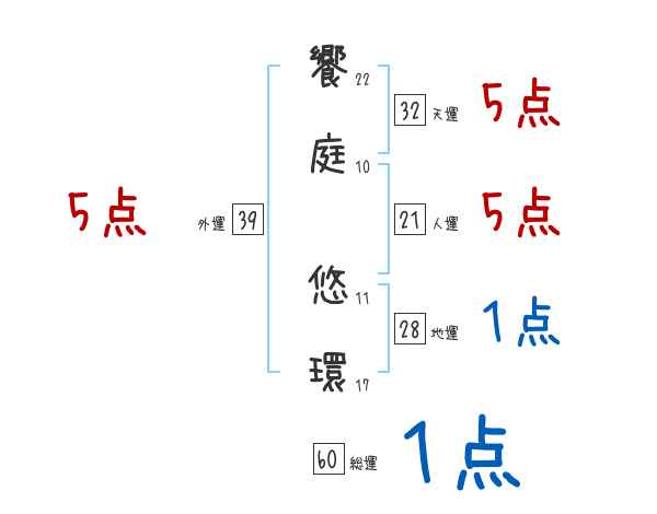 天運![]() | 饗庭悠環さんの天運は32画の5つ星!柔軟性があり成功する。チャンスが多く金運が良い。 家系が持つ宿命的な運勢を表します。祖先から受け継いだ苗字ですので自分の力が及びません。家柄を象徴します。 |