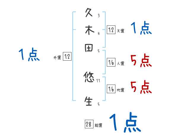 地運![]() | 久木田悠生さんの地運は16画の5つ星!人望が厚く大きく発展する。逆転成功が見える。 個性を表す基礎的な運勢です。性格形成や対人関係、行動力など家庭環境に影響されます。主に誕生してから20歳くらいまでの若年期の運勢を表します。 |