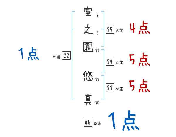 人運![]() | 室之園悠真さんの人運は24画の5つ星!家庭運が良く順調な人生。金運にも恵まれる。 性格や才能などを表す2番目に重要な運勢です。人間関係や協調性、社会的な成功に影響します。主に20歳から50歳ぐらいまでの中年期の運勢を表します。 |