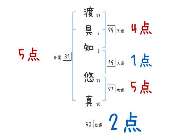 外運![]() | 渡具知悠真さんの外運は31画の5つ星!社交性があり判断力に優れる。順風満帆な人生で円満な生活。 生活面を象徴する運勢です。外部から受ける影響力を表し、結婚運、家庭運や職場、環境への順応性を表します。 |